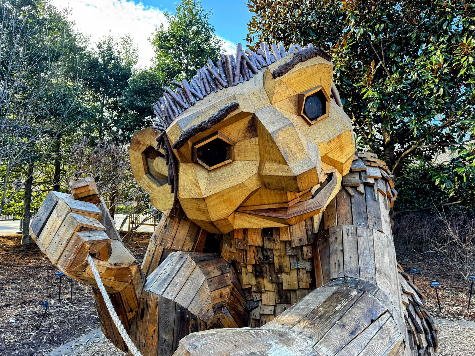 If you are lucky enough to be in Western North Carolina this week, however, exuberant whimsey awaits you at the North Carolina Arboretum. There, you will find Trolls: A Field Study, a temporary outdoor art installation by Danish artist Thomas Dambo, featuring twelve larger-than-life troll sculptures made from reclaimed wood, fallen branches, pallets, and other recycled materials. Each troll stands about seven to nine feet tall and all are scattered throughout the Arboretum’s gardens and trails.